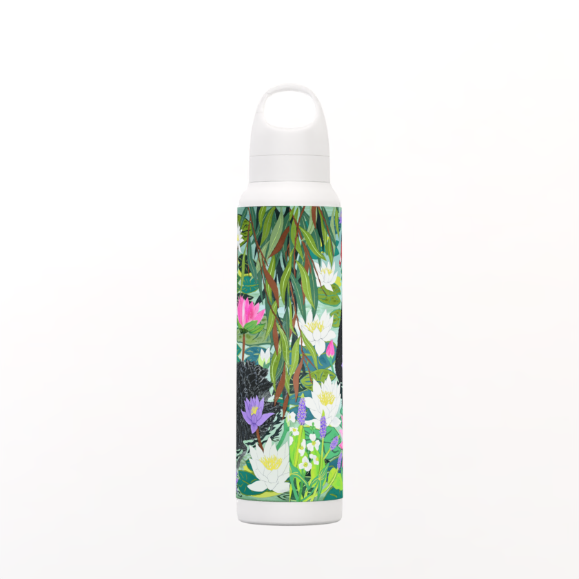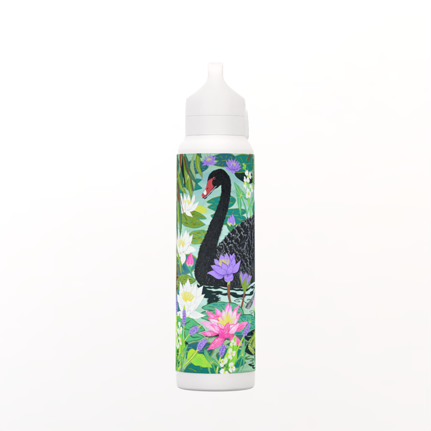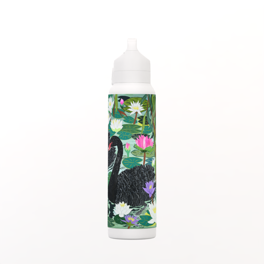 Black Swans and Water Lilies is a hand cut-paper art work by Fiona Scott-Wilson. We have printed this on this Akaw insulated, stainless steel bottle.