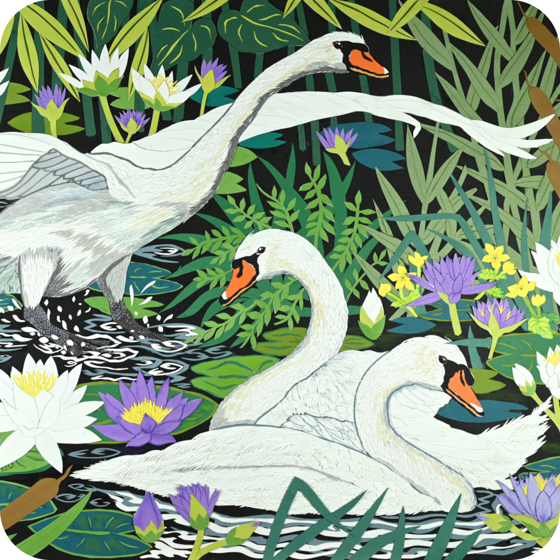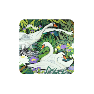 A set of 4 coasters with Fiona Scott-Wilson's Gliding Swans cut-paper design. Coasters are 9.5mm with vibrant colour and a cork base.