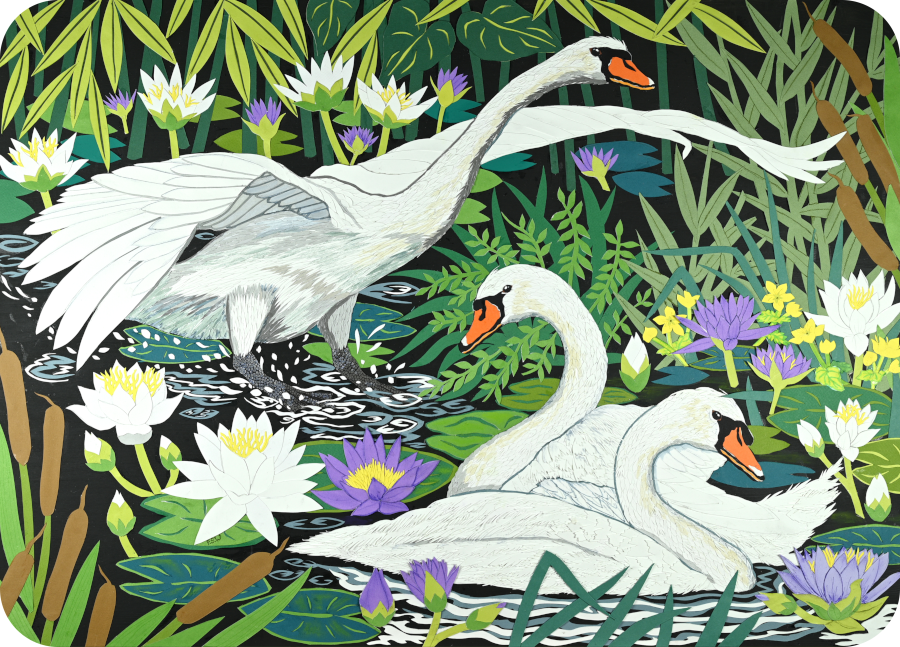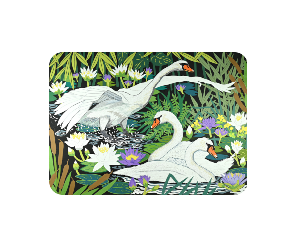 A placemat featuring Fiona Scott-Wilson's cut-paper artwork Gliding Swans