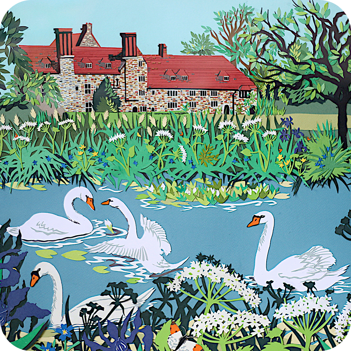 A set of 4 coasters with Fiona Scott-Wilson's Michelham Priory cut-paper design. Coasters are 9.5mm with vibrant colour and a cork base.