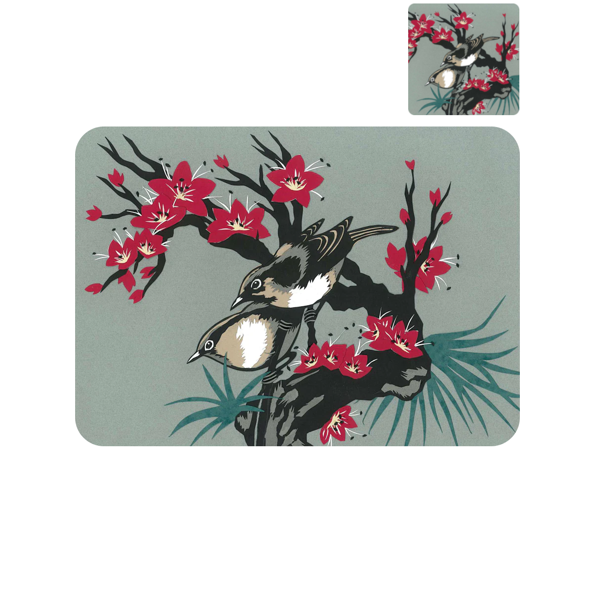 A set of 4 placemats and coasters featuring Fiona Scott-Wilson's cut-paper artwork Oriental Bird and Pink Blossom