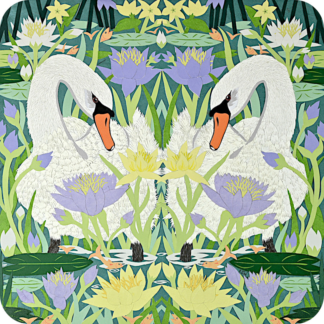A set of 4 coasters with Fiona Scott-Wilson's Reflection of Unity cut-paper design. Coasters are 9.5mm with vibrant colour and a cork base.