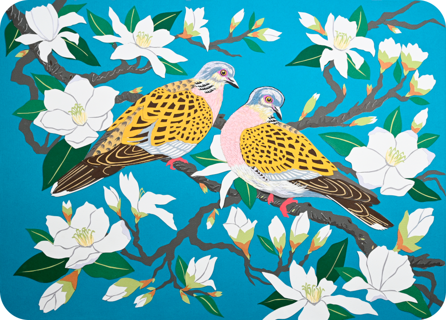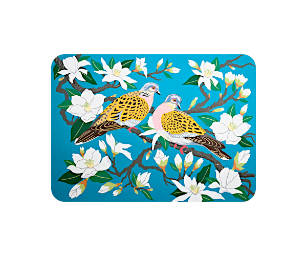 A placemat featuring Fiona Scott-Wilson's cut-paper artwork Turtle Doves on Magnolia